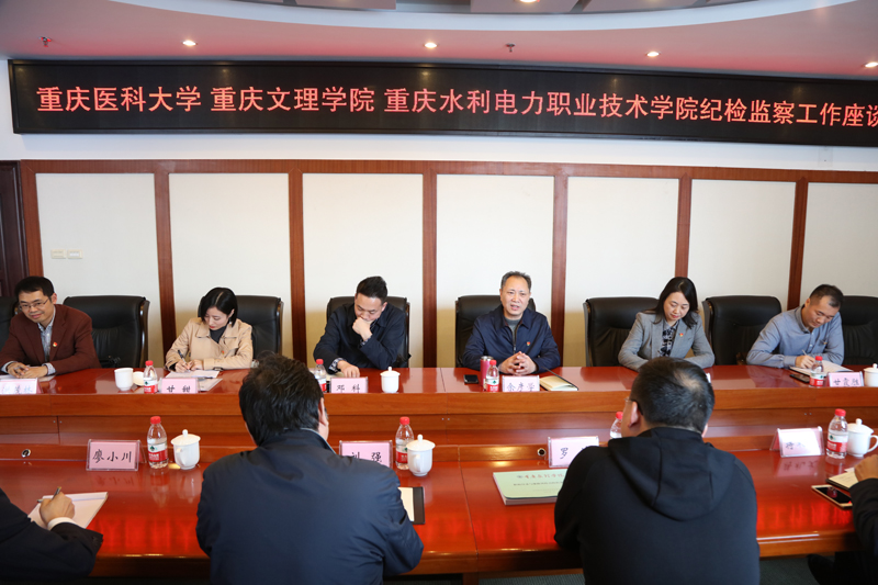 11月16日下午,重庆医科大学纪委书记、市监委驻校监察专员余彦学率重庆医科大学纪检监察室相关负责人来我校考察交流。重庆水利电力职业技术学院、重庆医科大学附属永川医院纪检监察相关负责人和我校纪委书记、市监委驻校监察专员罗茂,纪检监察室相关负责人参加交流座谈会。