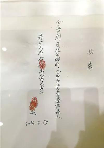 收据上的内容,其一为:今收到习近平等三人伙食费合计玖拾元正(整),落款人是梁玉明,落款时间是2015年2月13日;另一为:今收到习近平随行人员伙食费壹拾柒人共计人洋伍佰壹拾元整。从收据可以计算出,每人的伙食费是30元。